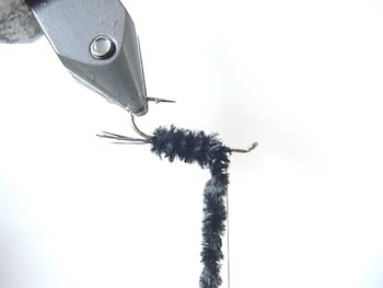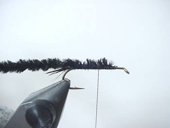 4- Enrole o chenille preto em volta da haste do anzol, até onde parou com a linha (centro da haste). Prenda o chenille com a linha, dando alguns nós. Lembre-se que esta amarração deverá ser feita de modo que o excesso de chenille fique para cima da haste, pois será utilizado para fazer o "wing-case". |